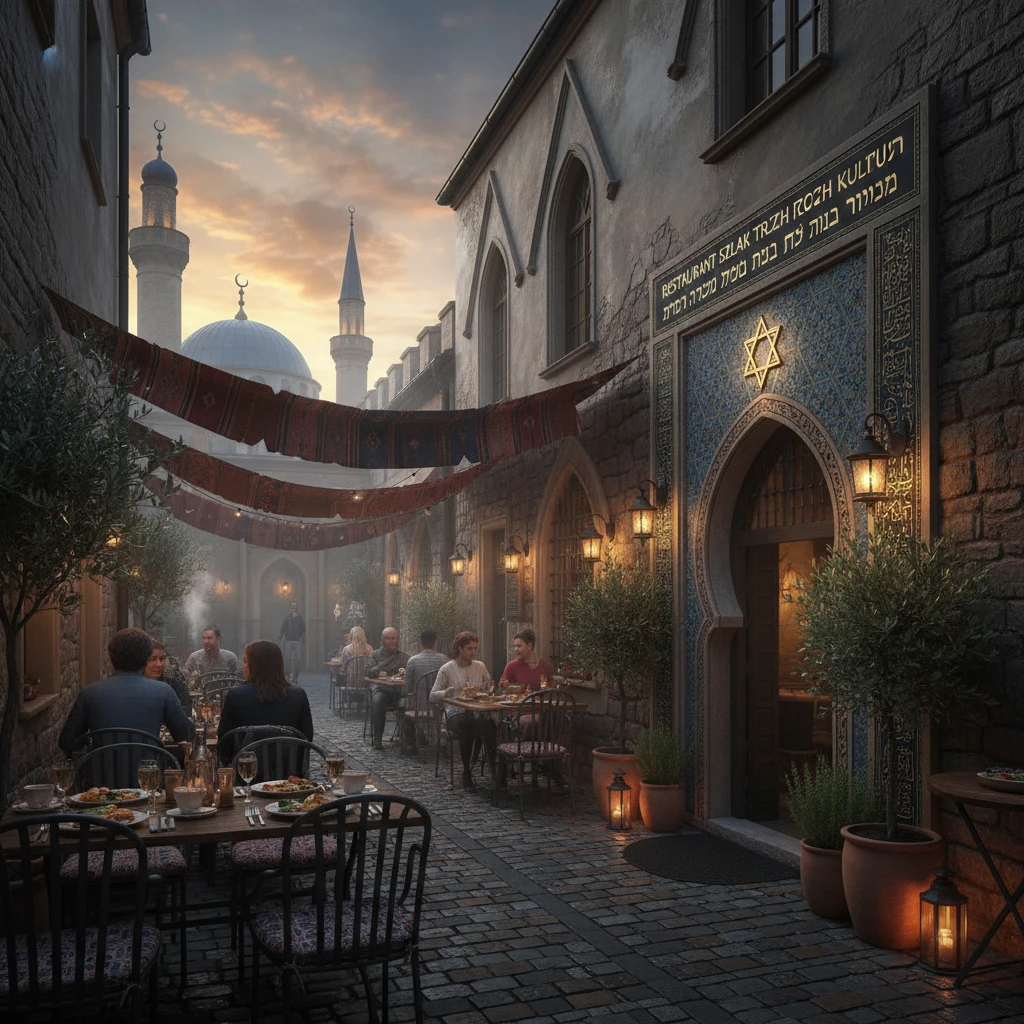 Malownicza ulica strefy restauracyjnej o zachodzie słońca, z widocznym znakiem Szlaku Trzech Kultur i gośćmi delektującymi się posiłkami na świeżym powietrzu.